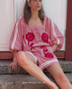 Abelone Top is a loose-fitted top made 100% organic cotton. It features cutlines with gatherings above the chest at the front and across the back. The top features elbow-length raglan sleeves with a balloon shape, soft lining inside, and elasticated sleeve openings. It has a square neckline with a tie-string threaded through a tunnel along the bottom neckline. The top is beautifully adorned with bold Suzani floral embroidery and wide zig-zag tapes on the sleeves for an eye-catching detail.