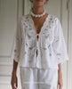 Adeline Top is a feminine top with a cutline below the chest and soft gatherings. It is made in 100% organic cotton and features wide, elbow-length sleeves with delicate gathers at the shoulders. The top has a deep V-neckline at the front and two sets of tie-strings placed at the placket. It is beautifully adorned with tone-in-tone embroidered cutwork inspired by a vintage tablecloth and finished with scalloped embroidered edges.