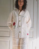 Bea Jacket is made in 100% organic cotton and has a casual fit. The jacket features a wide front placket with bone-look buttons. It has long sleeves with buttoned cuffs and slits. The jacket has a chest pocket and rounded front pockets, decorated with off-white pearl beads. It is decorated with delicate embroidery, including a large poppy motif on the back. Contrast stitching is added around the buttonholes as a small detail.