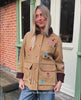 Cara Jacket has a loose fit with dropped shoulders and is made in 100% organic cotton twill. The collar and the inside of the sleeve bottoms are lined with leftover corduroy in a contrasting dark color, visible when the sleeves are turned up. It features two large utility pockets with flaps, lined with leftover corduroy, and a drawstring at the waist for an adjustable fit. The jacket is lined with leftover cotton featuring a dot print. Delicate embroidered motifs are spread across the jacket, telling a vibrant tale full of joy and life.