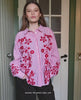 Cora Shirt is made from organic cotton poplin with red stripes. It features a classic collar and light mother-of-pearl buttons along the front placket. The shirt has firm cuffs with slits, a forward shoulder seam, and a yoke at the back. It is beautifully decorated with large statement floral embroidery on the front.