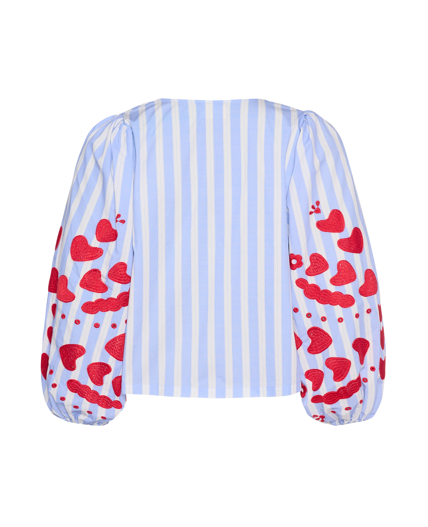 Elisabeth Top is a short feminine top made in 100% organic cotton poplin. The top has voluminous sleeves with elastic inside the sleeve opening. It has an open front and can be tied with two sets of thin bow tie strings. The top is decorated with our heart embroidery, which is delicately placed at the body at front and at the sleeves.