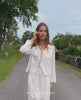 Elly Top is a feminine top made in 100% organic cotton. It features a loose fit at the front and an inverted box pleat on the back, which creates a more flared silhouette. The shirt has long, straight sleeves and a V-neckline with an oversized collar. The front placket is detailed with three sets of tie strings. It is beautifully decorated with cutwork embroidery inspired by a vintage tablecloth on the collar and front pocket, complemented by embroidered scalloped edges along the bottom hem and sleeve cuffs.