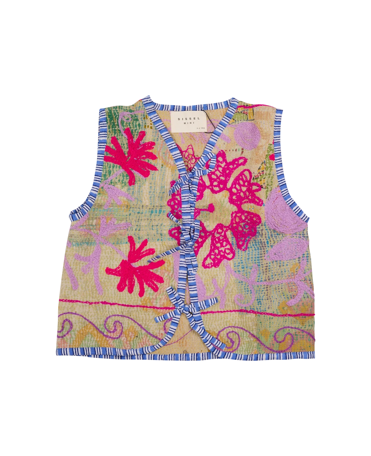 Gro MINI Vest is upcycled from a kantha blanket. The vest is beautifully decorated with colorful suzani embroidery, and all edges are covered with striped cotton tapes.