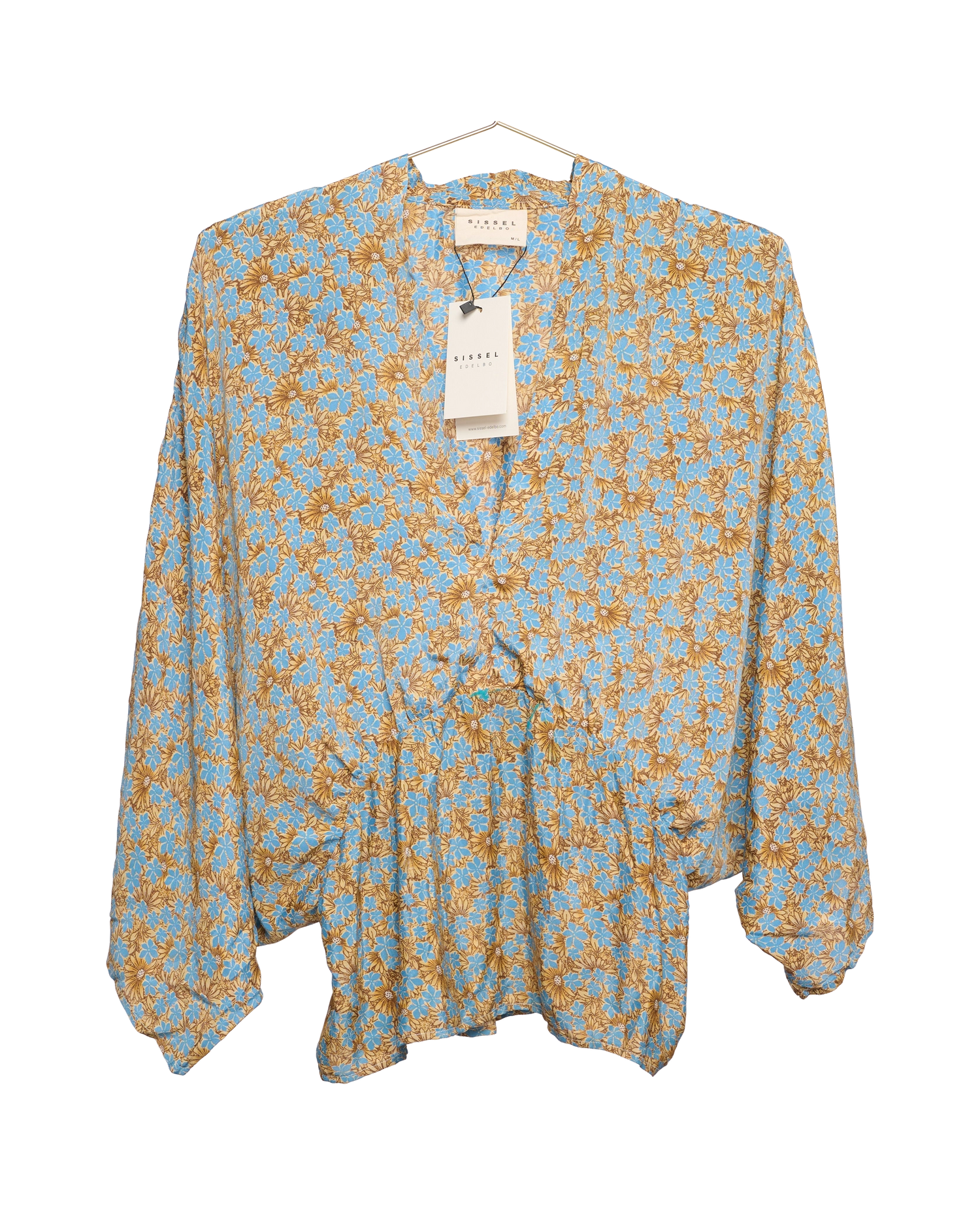 Juno Top features a deep V-neckline with a curved waistline front with gathers. The top has wide butterfly sleeves and is made with elastic smock in the waistline at back to enhance a feminine silhouette and a comfortable fit.