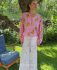 Limone Top is a feminine top with a regular fit made in 100% organic cotton with a beautiful all-over handmade screen print. The top has long and regular sleeves. It has o-neckline and can be close by four set of frog buttons at the front placket.