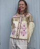 Mattie Jacket features a casual silhouette and is made in 100% organic cotton. It is lightly padded and quilt-stitched in a checkered pattern. The jacket has an O-neckline and pockets in the side seams. Its closure consists of four buttons on the front placket. Fringes run along the front and back yoke, adding a playful touch. The jacket is decorated with floral embroidered artwork placed on the front, back, and along the sleeve openings, and the edges are highlighted with bindings in a contrasting color.