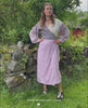 Paula Dress is a feminine wrap dress made from a mix of leftover cotton. It features voluminous long sleeves and ties at the waist with belt ends. The dress is decorated with beautiful artwork made of embroidery and beads, placed on the sleeves and the back.