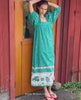 Ronda Dress features a loose shape made in printed 100% organic cotton It has voluminous puff sleeves with elastic smocking at the top and sleeve openings, creating small frills at the edges. The dress has a square neckline at the front and a deep neckline at the back, held together with tie strings. The dress has a cutline across the upper body with gathers. The print, with its romantic look, is inspired by a vintage tablecloth.