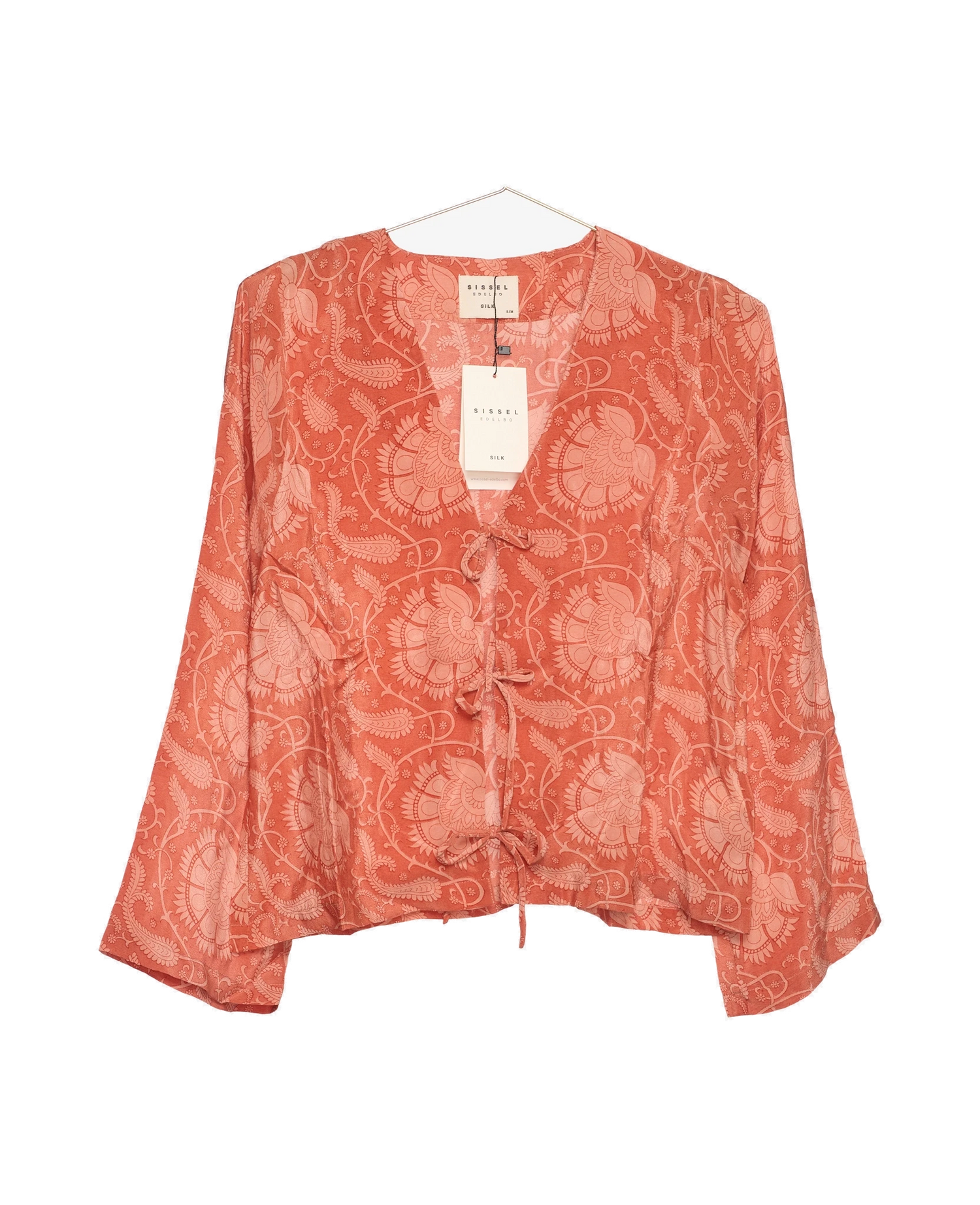 This unique item is made from a beautiful upcycled silk sari handpicked by SISSEL EDELBO. The sari has been worn by an Indian woman, which means that smaller imperfections, such as small stains and loose threads, will occur. However, to us these imperfections are the garment’s unique beauty flaws. They reflect the life and the love that the previous owner has added to the fabric. Each garment is one of a kind, and as part of its charm, you may notice differences in the prints and colors between the front and back of the piece. We hope you will love the story of the garment as much as we do.
