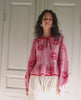 Sunny Top is made in leftover yarn-dyed seersucker and has a feminine fit. The top features a V-neckline with a tie band at the front. It has wide balloon sleeves with firm cuffs in a contrasting red color. The top features a peplum cutline that creates a beautifully feminine silhouette. It is decorated with delicate flower applications made from satin ribbons shaped in spirals with a center of glass beads.