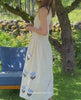 Svea Dress is a smocked pull-on dress with a dropped waistline and a wide skirt bottom, made from leftover cotton in yarn-dyed stripes. The top part features elastic smock stitching across both the front and back. The dress is decorated with appliquéd flowers and embroidery, while bold zig-zag tape is placed along the bottom hem.