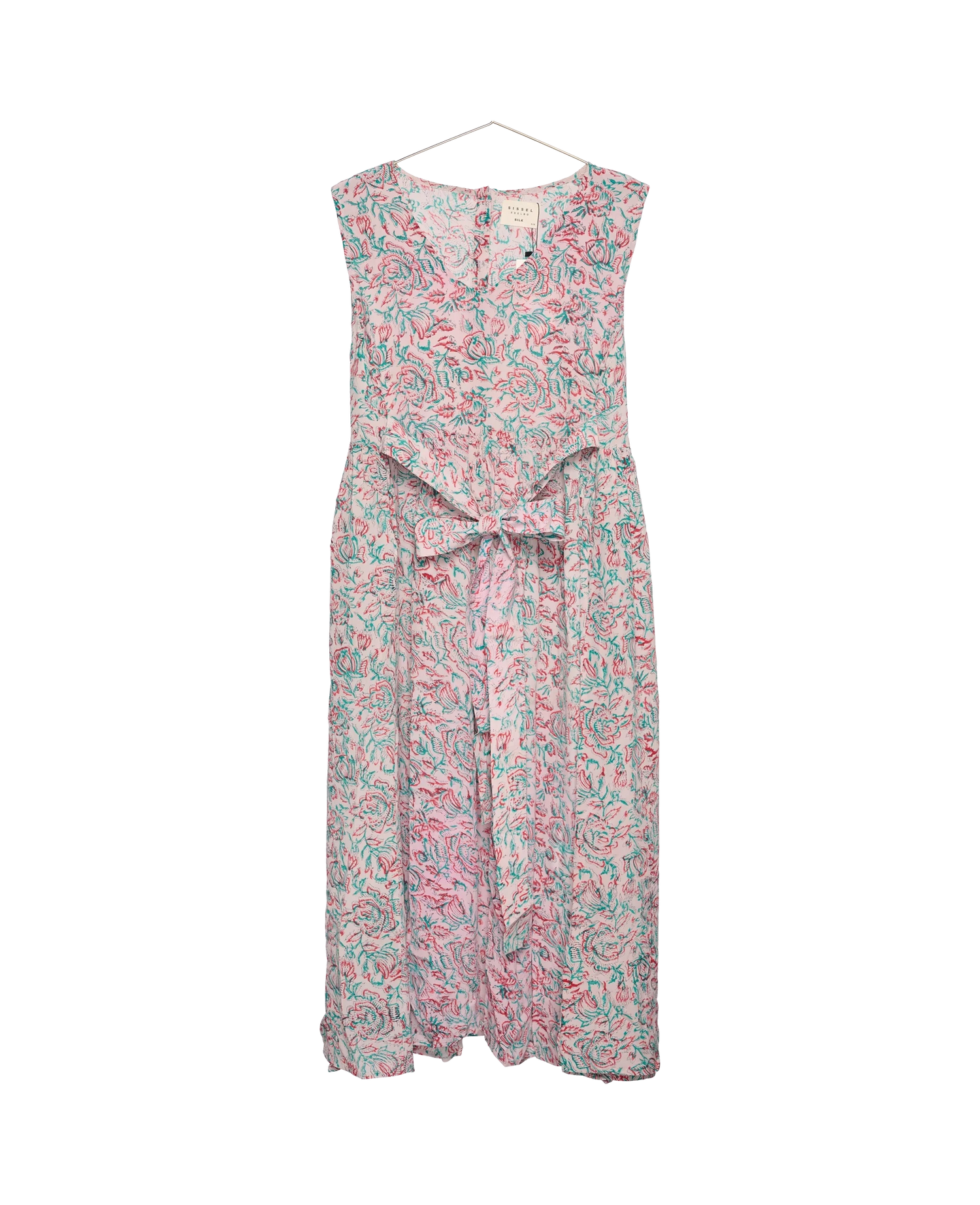 Tove SILK Dress is a casual yet feminine dress in a mid-length. The dress is sleeveless with wide shoulder straps and a V-neckline at front. The shape of the dress is inspired by the nineties vintage girlie dress and is made in a wide casual fit with lots of gathers along the waistline and pockets in the side seams. The dress comes with a wide atached belt, which can be tied as a big bow or just used as a regular belt. The neckline back has a buttoned placket.